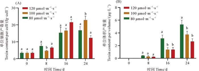 在微藻生长的前16天,不同光照强度下单位细胞产毒量不断增加。与第16天相比,第24天时80 μmol·m-2·s-1组中单位细胞产毒量无显著性差异(p>0.05),100 μmol·m-2·s-1组增加了37%,而120 μmol·m-2·s-1组降低了43%(见图 7(A))。120 μmol·m-2·s-1条件下在稳定生长期后期受光照强度影响其细胞受到损伤,藻细胞形态已经发生变化,单位细胞产毒量减少。