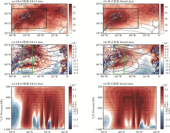 ( (a)—(b)中的黑框为本文划定的GS区域,其范围是(35°N—55°N,80°W—30°W);(c)—(d)中的蓝色等值线分别代表利用ERA5数据和控制试验数据得到的第0天SLP异常的合成(单位:hPa);(c)—(d)中的绿色方框划定了一个纬向范围(65°W—50°W),为分析各相关变量的垂直结构,文章对此范围内的变量进行纬向平均,而后得到经向-气压剖面图。黑色等值线为2000—2012年的冬季平均SST(单位:℃);灰色散点表示通过了显著性水平为5%的t检验。The black box in (a)—(b) is the GS region delineated in this paper, which ranges from (35°N—55°N, 80°W—30°W). Blue contours in (c)—(d) represent composites of SLP anomaly on day 0 derived from ERA5 data and data in control experiment, respectively (Unit: hPa). The green box in (c)—(d) delineates a latitudinal range (65°W—50°W). To analyze the vertical structure of each related variable, the variables in this range are averaged in the latitudinal direction, and then meridional-pressure profiles are obtained. Black contours represent mean SST in winter from 2000 to 2012 (Unit: ℃). Grey scatters indicate the composites and differences passed t test with a significance level of 5%. ) 图 1 使用ERA5数据和控制试验数据得到的2000—2012年冬季的气旋性扰动异常发生频率((a),(b),填色,单位:%)、第0天700 hPa处的垂直速度(填色,单位:Pa·s-1)的合成((c),(d))以及第0天的垂直速度(填色,单位:Pa·s-1)的剖面((e),(f)) Fig. 1 Cyclonic turbulence frequency(shading, Unit: %) of wintertime in 2000—2012 ((a), (b)), composites of 700 hPa vertical velocity(shading, Unit: Pa·s-1) on day 0 ((c), (d)) and vertical profiles of vertical velocity(shading, Unit: Pa·s-1) on day 0 ((e), (f))) derived from ERA5 data and data in control experiment |
