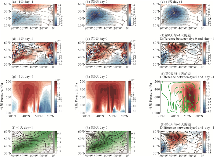 为考察气旋性扰动异常中各变量的发展演变情况,本文基于合成分析结果,将气旋性扰动异常中心到达GS区海洋锋上空时定义为第0天,把气旋性扰动异常中心到达海洋锋上空的前一天和后一天定义为-1天和+1天。在-1天时,气旋性扰动异常前部已到达海洋锋上空(见图 2(a))。在第0天,与前一天相比,扰动异常中心的SLP异常加强了约80%(见图 2(b))。而到了+1天,SLP负异常的最值基本不变,其中心向东北方向移动(见图 2(c))。从垂直速度来看,在-1天,仅存在南支上升流(见图 2(d),2(g));到了第0天,随着扰动异常的加强,位于50°N附近的北支上升流形成(见图 2(e)—2(f),2(h)—2(i)),且此处上升气流的最大强度超过0.05 Pa/s,可影响300 hPa附近的高空(见图 2(h))。此外,随着气旋性扰动异常的发展和上升运动的加强,扰动异常中心北侧的降水也在第0天加强了约10%~80%(见图 2(j)—2(l))。