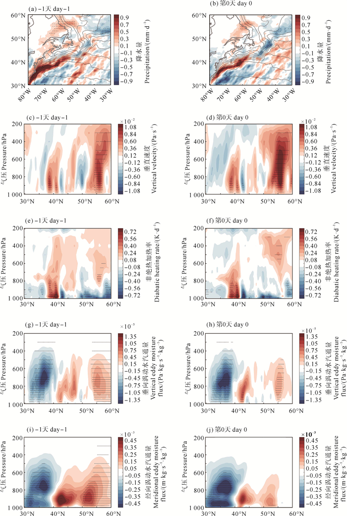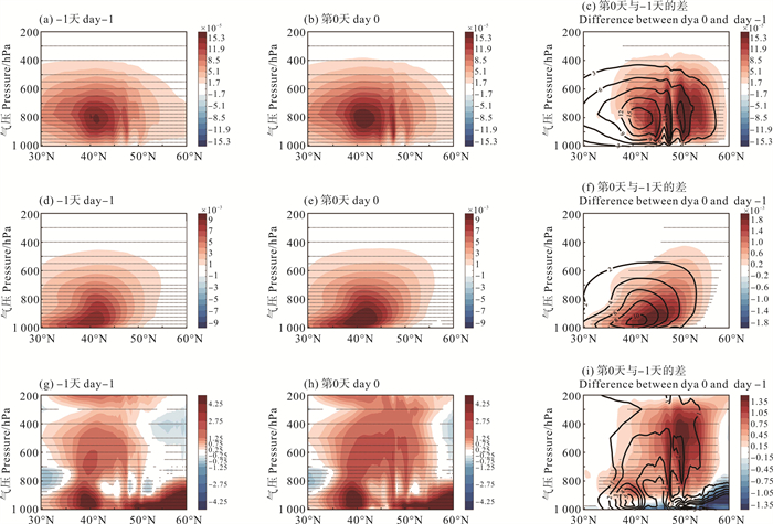 接下来,本文进一步讨论了涡动水汽通量。涡动水汽通量在水汽输送中具有重要意义[29],它影响着局地降水和蒸发过程。由图 3(a)和3(d)可知,垂向和经向的涡动水汽通量大值区均主要位于海洋锋北侧(40°N—45°N),随着气旋性扰动异常的发展,第0天的垂向涡动水汽通量主要在50°N附近显著变大(见图 3(a)—3(c)),这是由北支上升流的发展所造成的。而第0天的经向涡动水汽通量主要在40°N—50°N处(扰动异常中心附近)显著增强(见图 3(d)—3(f)),表明海洋锋上空的海气相互作用过程增强了向气旋性扰动异常的水汽输送。这有利于气旋性扰动的进一步发展。此外,从非绝热加热率的垂直剖面图能更清楚地看到,在水汽输送变强的背景下,伴随着强上升运动,气旋性扰动异常中心以北的非绝热加热也显著加强(见图 3(g)—3(i)),这和垂直速度以及降水量的变化是大体对应的。