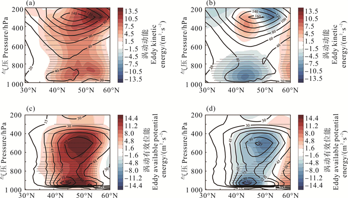 2.2 GS区气旋内上升气流快速发展的物理机制图 4给出了在气旋性扰动异常发展过程中的EKE和EAPE的垂向剖面。EKE的中心位于40°N—50°N、300 hPa附近(见图 4(a))。从-1天到第0天,EKE在45°N以北出现了大幅增长,其最大强度增加了约5.7%(见图 4(a)),和气旋性扰动异常在海洋锋上空快速加强一致。而到了+1天,它在50°N以南的低空减弱,在EKE大值中心以及55°N以北增强(见图 4(b)),表明气旋性扰动异常在向高空及向北发展。EAPE则有两个极值中心:一个位于低空海洋锋面北侧(40°N—50°N);另一个位于45°N以北、500 hPa上空附近(见图 4(c))。与-1天相比,第0天的EAPE主要在40°N—55°N大幅增强,其最大强度增大了约15.6%(见图 4(c)),为此处EKE的增强提供了能量来源。到了+1天,和EKE一致,它继续向北发展(见图 4(d))。