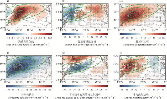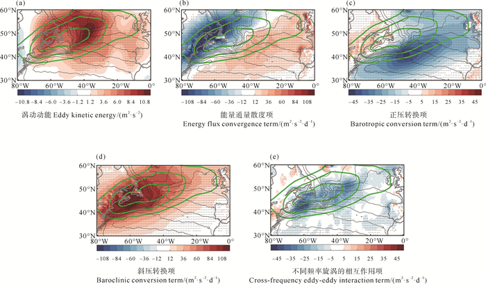 EKE的空间分布呈“西南-东北”走势,其最大强度超过80 m2·s-2(见图 5(a)),与Dai等[22]的结果相似。在EKE方程的各项中,斜压转换项为正,其大值区与EKE时间变化的大值区近乎重合,且它的最大强度超过了110 m2·s-2·d-1(见图 5(d)),是EKE最主要的源。曾鼎文等[32]也指出,在0°以西的区域,与斜压转换项相关的斜压转换机制是促进EKE增强的最主要机制。能量通量散度项在北美大陆东部以及海盆西侧有着很强的负值,在东部海域则有着较弱的正值(见图 5(b))。该项的作用是把EKE再分配到下游(东部)斜压性更弱的地区,使风暴轴向下游延伸,即“下游发展效应”[33-34]。另外,正压转换项和不同频率涡旋的相互作用项总体上起到对高频EKE的耗散作用,且它们对EKE变化的贡献小于能量通量散度项和斜压转换项(见图 5(c),5(e))。通过对EKE方程的分析,我们发现能量通量散度项和斜压转换项是量级最大的两项,而斜压转换机制是EKE增长的最重要的物理机制。