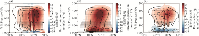 为进一步考察EKE、EAPE方程各项在气旋性扰动异常发展过程中的变化,我们分析了斜压产生项、斜压转换项和非绝热加热项的垂向分布。作为EKE的源,斜压转换项的大值区位于45°N—50°N、600—500 hPa附近(见图 7(a))。如前所述,它代表着涡动热量垂向输送,说明EKE和EAPE之间的转换是通过冷暖空气的上升下沉运动来完成的。在第0天,此项在45°N以北迅速加强,其最大强度增加了约27%(见图 7(a)),这促进了此处向上的涡动热量输送和EKE的生成。作为EAPE最主要的源,与EAPE一致,斜压产生项在低空和500 hPa附近有两个极值中心(见图 7(b))。在第0天,该项在50°N附近的500 hPa处加强了40%以上(见图 7(b)),有利于MAPE转化为EAPE。同时,EAPE的增加也更有利于其转化为EKE,这和斜压转换项以及EKE在这一天大幅加强相对应。而作为EAPE的另一个源,非绝热加热项主要在垂直运动和非绝热加热率大幅变化的区域(50°N附近、800 hPa以上的高空)起作用(见图 7(c))。总之,我们通过能量收支分析发现,在气旋性扰动异常到达海洋锋上空时,其中心及北侧的EAPE和EKE显著加强,这与斜压产生项、非绝热加热项、斜压转换项有关。