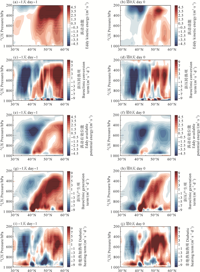 总之,在-1天,气旋性扰动异常中心位于40°N附近、海洋锋上空。依据Hirata等[13]的研究,此时,气旋西北部的冷输送带将干冷空气吹向暖湿的海洋锋南侧,从而释放出大量的水汽和潜热通量。这促进了海洋锋面上空的垂直上升运动,并进一步激发了强降水及高空非绝热加热。同时,在气旋性扰动异常内扰动风场的作用下,海洋锋将水汽及热量向扰动异常中心以北输送,因此EAPE方程中的斜压产生项对海洋锋的响应也显著增强。这加强了EAPE,并进一步导致EKE显著变大。而在第0天,受海洋锋影响,气旋性扰动异常内的北支上升流显著增强,这加强了扰动异常中心以北的降水和高空非绝热加热,所以EAPE方程中的非绝热加热项在第0天大幅加强。除此之外,斜压产生项也在第0天继续促进高空EKE变大。