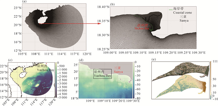( (a)网格模型,(b)崖州湾周边网格,(c)模型水深(填色,单位:m),(d)崖州湾周边水深(填色,单位:m),(e)崖州湾陆域高程(填色,单位:m)。(a) Model grid; (b) Model grid near Yazhou Bay; (c) Model bathymetry (shading; Unit: m); (d) Bathymetry around Yazhou Bay (shading; Unit: m); (e) Land elevation by Yazhou Bay(shading; Unit: m). ) 图 1 研究区域模型网格以及水深地形图 Fig. 1 The model grid for the study area and the topography |