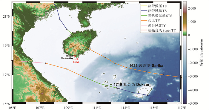 图 3 1621号和1719号台风强度路径和三亚验潮站位置 Fig. 3 Tracks and intensities of Typhoon 1621 and 1719 and the location of the Sanya tidal station |
