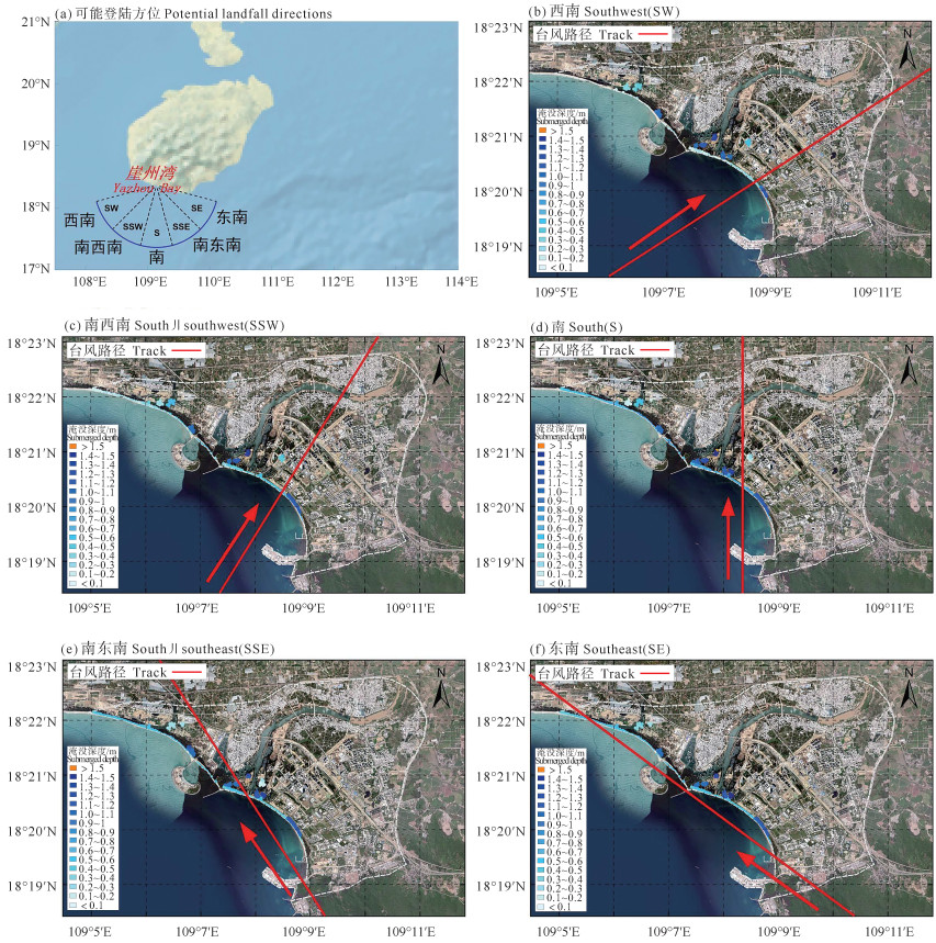 3.2 不同登陆方向台风风暴潮漫滩分析崖州湾位于三亚南山腹地,南山在其东侧形成了天然的屏障。因此本研究参考庞古乾等[33]对最大台风路径设计,如图 5(a)选取西南(SW)、南西南(SSW)、南(S)、南东南(SSE)和东南(SE)五个方向可能的台风路径模拟从崖州湾登陆的超强台风事件,台风登陆时中心气压930 hPa,台风达到超强台风等级,使用模型模拟台风风暴潮过程模型时间设置与验证时相同,记录台风风暴潮洪水漫滩导致海岸最大淹没范围和对应淹没深度情况(见图 5(b)—5(f))。