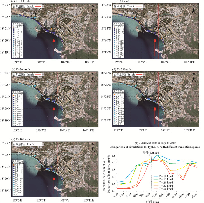 台风移动速度对风暴潮洪水强度和漫滩范围有显著影响。移动速度为10 km/h的台风风暴潮漫滩最大淹没深度1.64 m,淹没占区域面积之比2.57%;速度为15 km/h的台风风暴潮漫滩最大增水淹没深度1.58 m,淹没占比2.52%;速度为20 km/h的台风风暴潮漫滩最大淹没深度1.55 m,淹没占比2.27%;速度为25 km/h的台风风暴潮漫滩最大淹没深度1.55 m,淹没占比2.21%;速度为30 km/h的台风风暴潮漫滩最大淹没深度1.45 m,淹没占比2.18%(见表 4)。结果表明,较低的台风移动速度会导致更强的风暴潮洪水和更大的漫滩范围,慢速台风的威胁更大;而台风移动速度较快时,风暴潮洪水淹没和衰退速度也增快,淹没面积也相对较小,但其致灾危害性不容忽视(见图 6(f))。