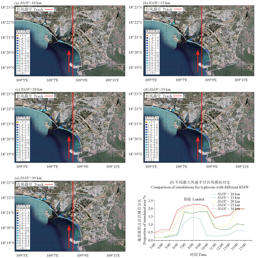 通过对不同最大风速半径的台风风暴潮模拟发现,更大的RMW台风登陆会导致更大的淹没深度和淹没范围。RMW为10 km的台风风暴潮漫滩最大淹没深度1.20 m,淹没面积占区域面积之比1.31%;RMW为15 km的台风风暴潮漫滩最大淹没深度1.38 m,淹没占比1.82%;RMW为20 km的台风风暴潮漫滩最大淹没深度1.39 m,淹没占比2.06%;RMW为25 km的台风风暴潮漫滩最大淹没深度1.55 m,淹没占比2.27%;RMW为30 km的台风风暴潮漫滩最大淹没深度1.56 m,淹没占比2.32%(见表 5)。登陆台风最大风速半径越大,整个崖州湾海岸因台风风暴潮导致的淹没范围越大(见图 7(f)),整体的淹没深度也越高,尤其是对靠近崖州湾河流入海口东侧的沿海区域,受到更大的台风风暴潮漫滩威胁,需特别关注和防范。