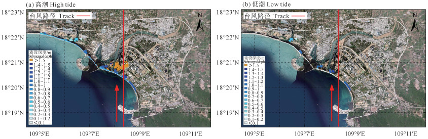 在高潮、平潮期间登陆的超强台风风暴潮漫滩淹没面积1.11 km2,最大淹没深度2.01 m,淹没面积占区域面积之比3.4%;在低潮停潮期间登陆的台风风暴潮漫滩淹没面积0.37 km2,最大淹没深度1.37 m,淹没占比1.14%。天文潮的相位作为天文潮影响水平面高度的主要因素,风暴潮叠加高潮平潮时的淹没面积是叠加低潮停潮时的3倍,天文潮相位对崖州湾台风风暴潮漫滩最大增水和淹没面积有十分显著的影响。