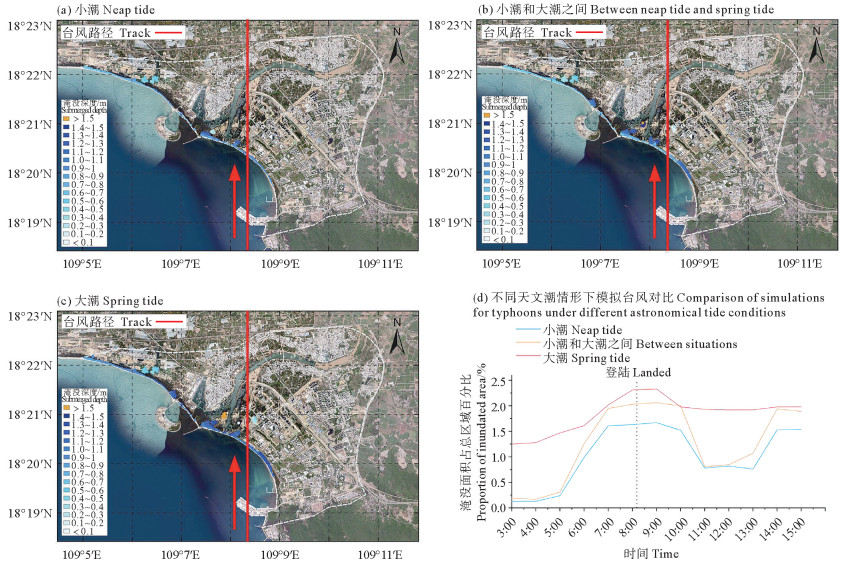 在小潮期间登陆的台风风暴潮漫滩最大淹没深度1.25 m,淹没面积占区域面积之比1.67%;小潮到大潮期间登陆的台风风暴潮在崖州湾科技城南部的海岸向内陆有了更深的淹没距离,最大淹没深度1.55 m,淹没占比2.27%;在大潮期间登陆的台风对于风暴潮漫滩有更高的增水和更大的淹没面积,最大淹没深度1.68 m,淹没占比2.33%,同时在台风期间风暴潮叠加天文大潮会导致长时间大范围的淹没(见图 9(d))。天文潮作为影响水平面高度的主要原因,不同的天文潮情形对风暴潮引起的最大增水和淹没占比有显著影响(见表 6)。