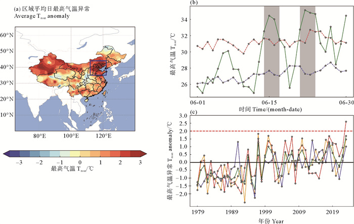 ( (a)中蓝框区域为华北区域(112°E—122°E,35°N—44°N); (b)中蓝色虚线为气候态值,红色虚线为90%温度阈值,阴影为识别的热浪事件; (c)中红线表示6月,橙线为7月,蓝线为8月,绿线为夏季平均。The blue boxes in (a) represent the North China (112°E—122°E, 35°N—44°N); (b) The blue dashed line represents the climate state value, the red dashed line represents the 90% temperature threshold, and the shadow represents the identified heat wave event; (c) The red line is June, orange line is July, blue line is August, and green line is summer mean. ) 图 1 (a) 2023年6月平均日最高气温(Tmax)距平(单位:℃)、(b)2023年6月华北地区区域平均日最高气温序列、(c)1979—2023年6、7、8月华北平均Tmax异常 Fig. 1 (a) The average maximum temperature (Tmax) anomaly distribution in June, 2023 (unit: ℃), (b) the average Tmax time series in the North China in June 2023, (c) the average Tmax anomaly in North China from June, July, and August during 1979 to 2023 |