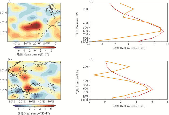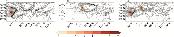 图 10 LBM数值试验中(a)大西洋东部和(b)欧洲中部的热源强迫(填色,单位:K·d-1)和200 hPa位势高度(黑色等值线,单位:gpm)的稳定响应和(c)两处热强迫的共同作用(即(a)+(b)) Fig. 10 The imposed heat forcing (shading, unit: K·d-1) and the corresponding steady response of geopotential height (black contour, Unit: gpm) at 200 hPa by (a) Eastern Atlantic and (b) Central Europe in LBM experiment and (c) the combined effect of the two heat forcing ((a)+(b)) |