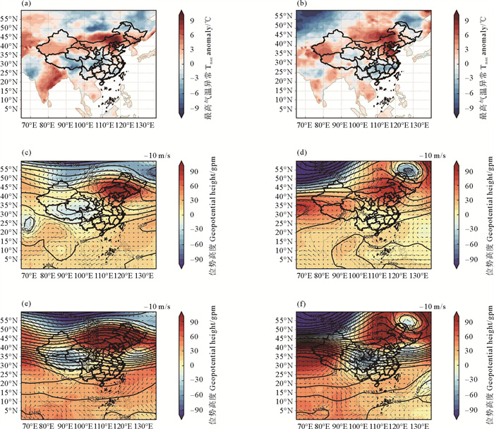 ( 图(a、c、e)为6月14—17日平均,(b、d、f)为6月21—24日平均。Fig.(a, c, e) denote June 14—17 mean, Fig.(b, d, f) denote June 21—24 mean. ) 图 2 平均日最高气温距平(a、b)、500 hPa(c、d)、200 hPa(e、f)位势高度和风场(矢量,单位:m/s)距平 Fig. 2 Average Tmax (a, b), 500 hPa (c, d)、200 hPa (e、f) potential height and wind field (vector, Unit: m/s) anomaly |