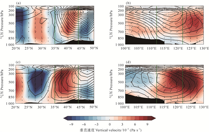 ( (a、c)的经度平均范围为112°N—122°N,时间分别为2023年6月14—17日和21—24日; (b、d)的纬度平均范围为35°E—44°E,时间同(a)、(c); 绿色线条为华北所处的经纬度范围。(a), (c) The average range of longitude in height-latitude profiles is 112°N—122°N, and the times are June 14—17 and June 21—24, respectively; (b, d) The average range of latitude in height-longitude profiles is 35°E—44°E, with the same time as (a) and (c); green solid line indicating the latitude and longitude of North China. ) 图 3 平均的位势高度(等值线,单位:gpm)、风矢量(单位:m·s-1(水平),Pa·s-1(垂直))和垂直速度异常的高度-纬度剖面(a、c)和高度-经度剖面(b、d) Fig. 3 Anomalies of height-latitude profile of geopotential height (contour, unit: gpm), wind vector (unit: m·s-1 (horizontal), Pa·s-1 (vertical)) (a, c) and divergence and height-longitude profile (b, d) |