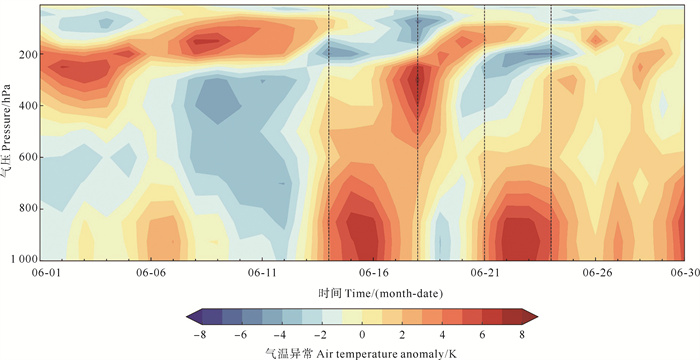 ( 黑色虚线表示已识别的热浪事件时间段。The black dashed line represents the time period of identified heat wave events. ) 图 4 2023年6月华北区域气温异常的高度-时间序列 Fig. 4 Time series of anomalous temperature of North China in June, 2023 |