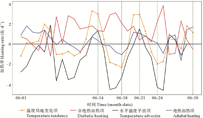 图 5 2023年6月华北区域平均的850 hPa温度倾向方程各项诊断量的演变 Fig. 5 Evolution of diagnostic variables in the 850 hPa average temperature tendency equation of North China in June, 2023 |