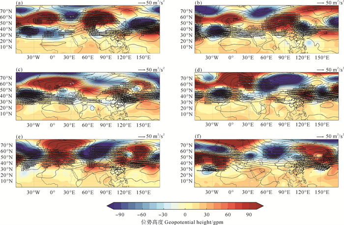 图 6 2023年6月(a)1—5、(b)6—10、(c)11—15、(d)16—20、(e)21—25、(f)25—30日平均的500 hPa位势高度异常和大于10 m2·s-2的200 hPa波作用通量(矢量) Fig. 6 Averaged geopotential height anomaly at 500 hPa and WAF at 200 hPa of magnitude not less than 10 m2·s-2 (vector) on (a) June 1—5, (b)June 6—10, (c)June 11—15, (d) June 16—20, (e)June 21—25, (f)June 26—30, 2023 |