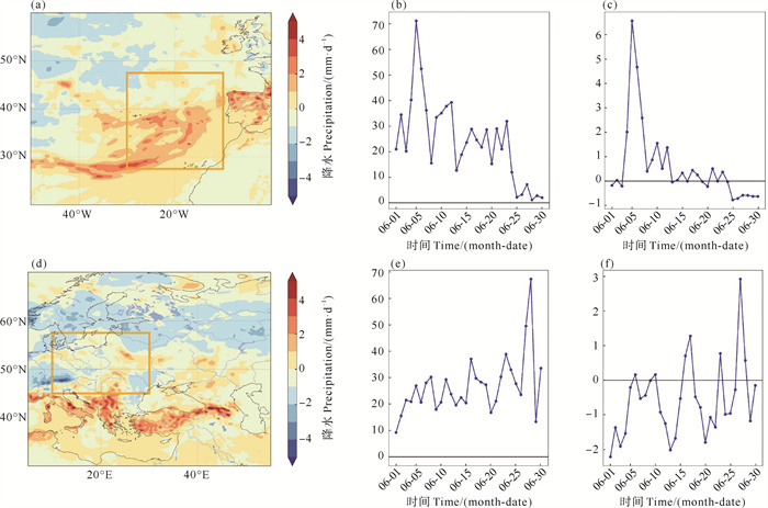 ( (a、d)中橙色框为大西洋东部(10°W—30°W,27.5°N—47.5°N)与欧洲中部(10°E—30°E,45°N—57.5°N)最大和平均降水异常的框选区域。The orange boxes in (a, d) represent the selected areas with the maximum and average precipitation anomalies in the region. ) 图 7 6月平均降水异常(a、d)、关键区域的最大降水异常(b、e)和区域平均降水异常(c、f)(单位:mm) Fig. 7 Average precipitation anomaly in June (a, d), maximum precipitation anomaly (b, e), and average precipitation anomaly (c, f) (unit: mm) |