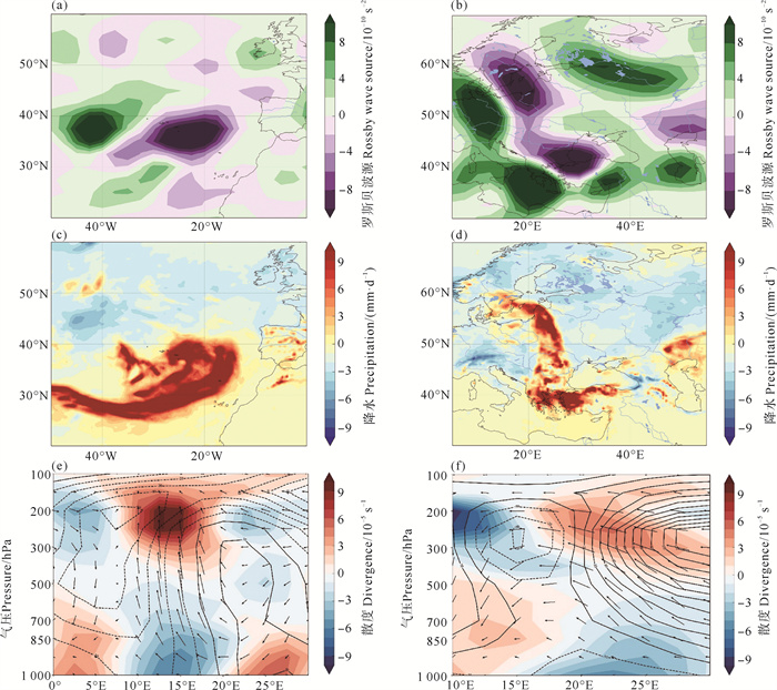 3.2 异常大气环流的形成机制降水系统对应的高低空辐合辐散异常与罗斯贝波源的产生密切相关[33]。根据对6月欧亚大陆区域的降水异常分析,大西洋东部有异常偏多的降水(见图 7(a)),在6月中上旬,大西洋地区的降水极值与区域平均降水均异常偏大(见图 7(b)、7(c))。欧洲中部区域的月平均降水异常较小(见图 7(d)),但在热浪(Ⅱ)发生前仍有较大异常降水过程(见图 7(e)、7(f))。我们以该两处关键区在热浪发生前的最大一次降水过程为例,进一步对罗斯贝波源进行分析。2023年6月4—6日,大西洋东部出现最大降水过程,且在降水区域有明显的负波源(见图 8(a)、8(c)),6月17—18日,波罗的海上空存在降水异常与另一负波源(见图 8(b)、8(d))。降水区域的环流场在低层有辐合异常,高层有辐散异常(见图 8(e)、8(f)),两次降水高层的辐散中心均位于200 hPa高度上,且高低空辐合辐散相对应的垂直环流所在的经度范围均与罗斯贝负波源所在位置匹配,与前人结论一致[33]。
