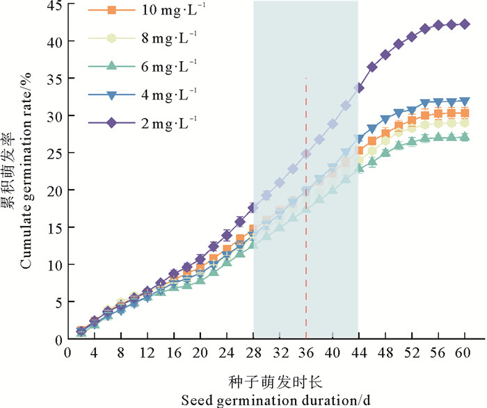 2 结果 2.1 种子萌发 2.1.1 累积萌发率随种子萌发时间增加,各处理组的累积萌发率均呈现缓慢增加-快速增加-趋于平稳的趋势(见图 1)。单因素方差分析显示,实验期间各处理组的累积萌发率均存在显著差异。至萌发60 d,2 mg·L-1处理组的种子累积萌发率显著高于其他处理组,是对照组的1.5倍(P < 0.05)。