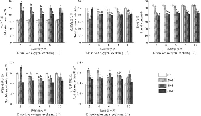 鳗草种子各项生理指标在不同萌发时期变化显著。种子萌发初期(0~20 d),所有处理组的α-淀粉酶活性显著升高,低氧处理组(2和4 mg·L-1)是对照组的1.1倍,显著高于其他各处理组(P < 0.05);至种子快速萌发期(20~40 d),与种子萌发初期相比,种子水分和可溶性糖含量明显升高而总蛋白质含量和淀粉含量显著下降(P < 0.05),其中2 mg·L-1处理组的水分和可溶性糖含量分别达到对照组的1.1和1.4倍、总蛋白质含量和淀粉含量分别降至对照组的85.5%和90.7%;至种子萌发缓滞期(40~60 d),2 mg·L-1处理组的总蛋白质含量迅速上升超过其他处理组,达到对照组的1.2倍(见图 2)。