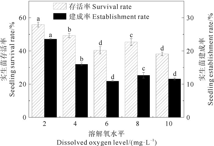 溶解氧水平对实生苗的存活率和建成率有显著影响(P < 0.05)。随溶解氧水平降低,实生苗的存活率和建成率总体呈上升趋势。经过50 d培育,2 mg·L-1处理组的存活率和建成率均最高,分别为对照组的1.2和1.9倍;而10 mg·L-1处理组的存活率最低,仅为对照组的84.2%(见图 3)。