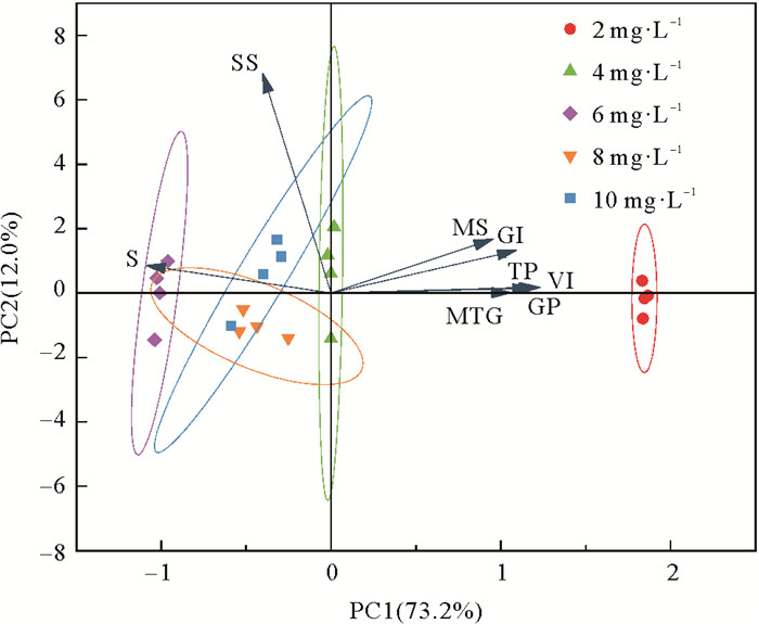对不同溶解氧水平条件下鳗草种子的萌发参数和生理指标进行主成分分析(见图 4)。结果显示,不同溶解氧水平处理间存在显著差异;种子淀粉含量和种子萌发具有显著负相关关系,而种子水分和总蛋白质含量则与种子萌发具有显著正相关关系(P < 0.05)。