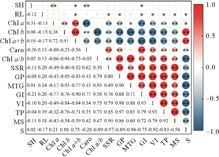 选取PCA分析中解释量较大的种子萌发和生理指标(S、MS、TP、VI、GI、MTG和GP)以及在各组间存在显著差异的植株生态学指标(SH、RL及光合色素)对实生苗存活率(SSR)进行Pearson相关性分析(见图 5)。结果显示,鳗草实生苗的存活率与种子的萌发及生理指标之间存在较强的相关性。实生苗存活率与种子总蛋白质含量、水分含量和萌发指标呈极显著正相关,与种子的淀粉含量,实生苗的叶绿素a含量、叶绿素b含量和总叶绿素含量均呈极显著负相关关系(P < 0.01);株高与总叶绿素呈显著正相关(P < 0.05)、与类胡萝卜素呈极显著负相关(P < 0.01);最大根长与总叶绿素、淀粉含量呈显著负相关(P < 0.05)。