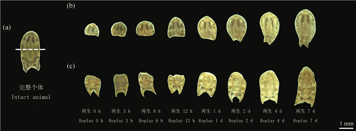 1 材料与方法 1.1 澳洲异尾涡虫的培养及再生样品采集将本研究所用的澳洲异尾涡虫置于光照恒温培养箱中培养, 设置光暗周期为光照16 h∶黑暗8 h, 其中光照环境温度21 ℃, 黑暗环境温度19 ℃, 培养在盛有过滤灭菌海水的玻璃培养皿中, 每3 d投喂一次新鲜孵化的丰年虾幼虫, 最后一次喂食丰年虾幼虫3 d后, 开展切割再生实验。