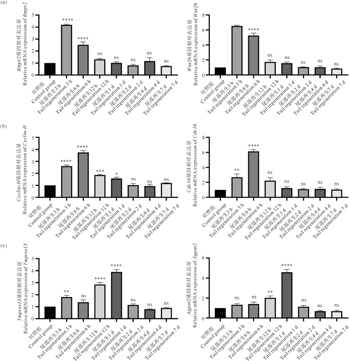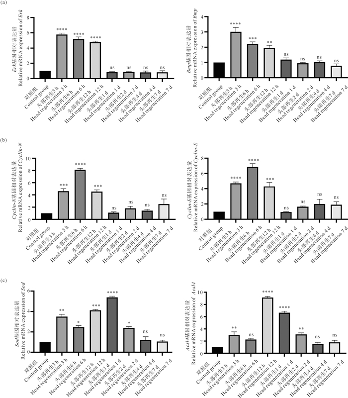((a) 头部组织再生关键信号通路基因模块两个枢纽基因相对表达量;(b) 头部组织细胞周期相关基因模块两个枢纽基因相对表达量;(c) 头部组织代谢相关基因模块两个枢纽基因相对表达量。ns表示与对照组相比无显著性; *表示显著性P<0.05;**表示显著性P<0.01;*表示显著性P<0.001;****表示显著性P<0.000 1。所有数据均以标准差(Mean±SEM)表示。(a) Relative mRNA expression level of two hub genes from key signaling pathway genes module in head tissue regeneration; (b) Relative mRNA expression level of two hub genes from cell cycle related genes module in head tissue regeneration; (c) Relative mRNA expression level of two hub genes from metabolic related genes module in head tissue regeneration. ns indicates no significant difference; * indicates significance P < 0.05; ** indicates significance P < 0.01; *** indicates significance P < 0.001; **** indicates significance P < 0.000 1 compared to the control group. The data are presented as mean±standard error of the mean.) 图 10 头部组织H7模块枢纽基因mRNA相对表达量 Fig. 10 Relative mRNA expression level of hub genes of H7 module |