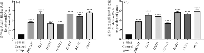 (***表示显著性P<0.001;****表示显著性P<0.000 1。所有数据均以Mean±SEM表示。***indicates significance P < 0.001; ****indicates significance P < 0.000 1 compared to the control group. The data are presented as mean±standard error of the mean.) 图 2 头部(a)和尾部(b)组织再生各时期共有差异表达基因相对表达量 Fig. 2 Relative mRNA expression level of representative differentially expressed genes both in the regeneration process of head(a) and tail(b) tissue |