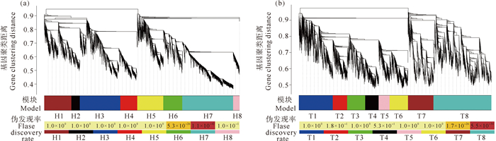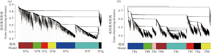 图 6 头部组织H7(a)和尾部组织T8(b)模块基因共表达网络聚类树 Fig. 6 WGCNA cluster tree for the module H7 in head tissue(a) and T8 in tail tissue(b) |