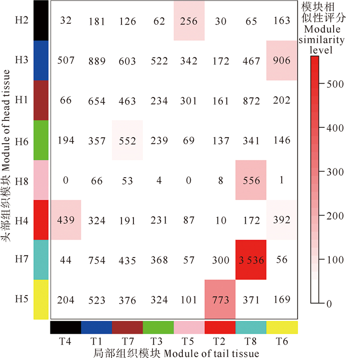 (表中数值代表两基因共表达模块间共有的基因数。The values in the table represents the number of genes shared between the two WGCNA modules.) 图 4 头部和尾部组织再生过程基因共表达模块相似性分析 Fig. 4 Similarity analysis of WGCNA modules for the regeneration process of head tissue and tail tissue |