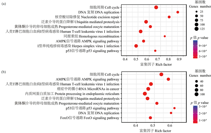结合差异表达基因富集分析(见图 3)与基因共表达模块相似性分析(见图 4)的结果,本研究以H7与T8模块为澳洲异尾涡虫再生关键模块进行后续分析。分别对H7与T8模块中的基因进行KEGG功能富集分析(见图 5),结果表明,H7模块基因显著富集的信号通路(p<0.05)与T8模块相似,均富集到了同细胞能量平衡维持功能有关的Ampk信号通路[17]、同细胞异常增殖抑制功能有关的p53信号通路[18]以及同DNA复制和细胞周期相关的信号通路。