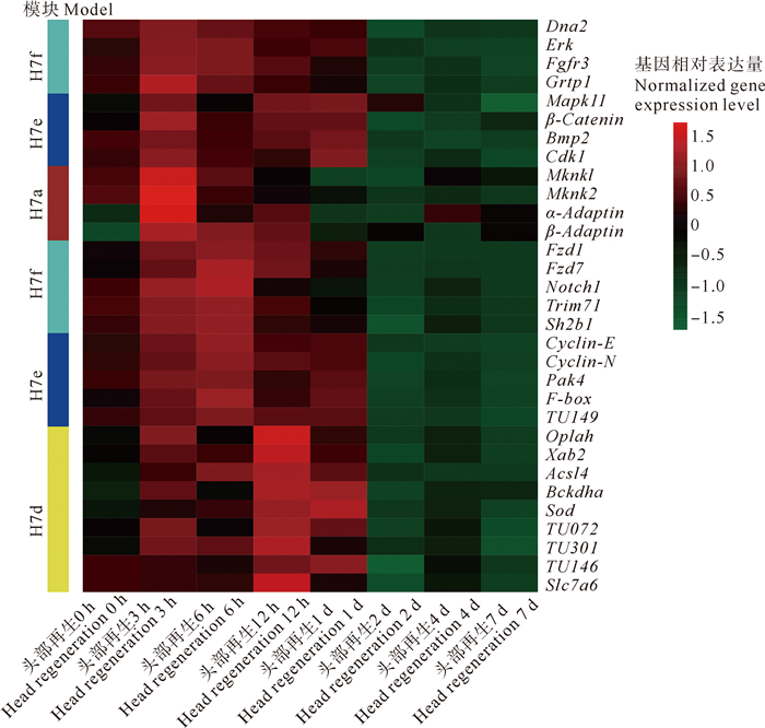 头部组织H7a模块的枢纽基因大多在再生3 h时高表达,主要包括衔接因子相关蛋白复合体基因Adaptin、Map激酶相互作用的丝氨酸/苏氨酸激酶基因Mknk。H7f模块的枢纽基因主要在再生3和6 h时高表达,其中:再生3 h时高表达的基因有胞外信号调节激酶Erk、DNA复制的解旋酶/核酸酶Dna2、丝裂原活化蛋白激酶基因Mapk3、纤母细胞生长因子受体Fgfr3和生长激素调节蛋白基因Grtp1;再生6 h时高表达的基因有卷曲蛋白基因Frizzled7、跨膜受体蛋白基因Notch和衔接蛋白基因Sh2b1等。与H7f模块同样在再生3和6 h高表达的H7e模块主要的枢纽基因包括在再生3 h时高表达的β-连环蛋白基因β-catenin、骨形态发生蛋白基因Bmp2和细胞周期蛋白依赖性激酶基因Cdk1,以及在再生6 h时高表达的细胞周期素基因Cyclin-N、细胞周期素基因Cyclin-E、丝氨酸/苏氨酸蛋白激酶基因Pak4、F-盒蛋白基因F-box等。在上述模块之后,在再生12 h和1 d时高表达的H7d模块中的基因主要包括5-氧脯氨酸酶基因Oplah、pre-mRNA剪接因子基因Xab2、长链脂酰辅酶A合成酶基因Acsl4、α-酮戊二酸脱氢酶α亚基基因Bckdha和超氧化物歧化酶基因Sod等。