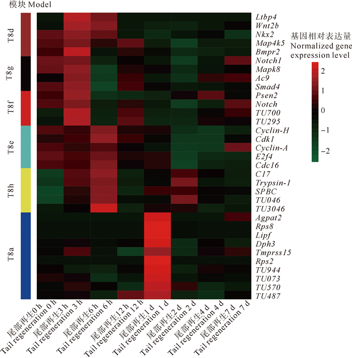 尾部组织再生过程中T8d、T8f和T8g模块最先在再生3 h时高表达,随后在再生6 h时T8e和T8h模块高表达,最后T8a模块中的基因在再生1 d时高表达。最先表达的T8d模块枢纽基因主要包括潜在转化生长因子结合蛋白基因Ltbp4、丝裂原活化蛋白激酶基因Map4k5和骨形态发生蛋白受体基因Bmpr2等。同样在再生3 h时高表达的T8g模块主要包括腺苷酸环化酶基因Ac9、介导TGF-β家族成员的信号转导基因Smad4。T8f模块主要包括早老素Presenilin2、跨膜受体蛋白Notch基因。在尾部组织再生6 h时高表达的T8e和T8h模块主要包括细胞周期蛋白基因Cyclin-A和Cyclin-H、细胞周期蛋白依赖性激酶基因Cdk1、转录因子基因E2f4、细胞分裂周期蛋白基因Cdc16以及胰蛋白酶基因Trypsin-1等。在再生1 d时高表达的T8a模块主要包括40S核糖体蛋白基因Rps2和Rps8、酰基转移酶基因Agpat2以及胃三酰甘油脂肪酶基因Lipf等。