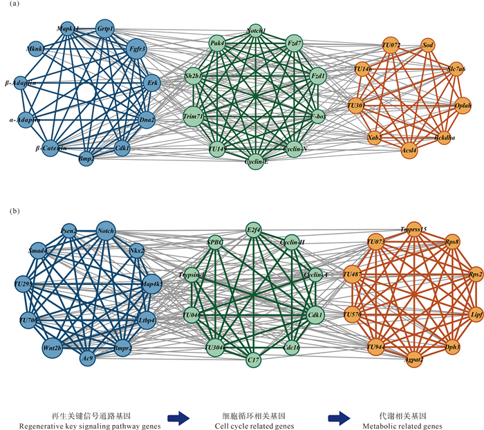 (图中各节点代表H7和T8各子模块中所选枢纽基因。不同颜色代表不同高表达再生时期的基因:蓝色代表再生3 h高表达的基因;绿色代表再生3~6 h高表达的基因;橙色代表再生12 h~1 d高表达的基因。(a)头部组织H7子模块可视化基因共表达网络;(b) 尾部组织T8子模块可视化基因共表达网络。Each node in the figure represents the picked hub gene in the submodule of H7 and T8, and different colors represent genes at different regeneration periods of high expression level: Blue represents genes with high expression level at 3h regeneration; Green represents genes with high expression level at 3~6 h regeneration; Orange represents genes with high expression level at 12 h~1 d regeneration. (a)Network interactions in the submodules of H7; (b) Network interactions in the submodules of T8.) 图 9 H7、T8子模块枢纽基因可视化基因共表达网络 Fig. 9 Network visualization of hub genes interactions in submodules of H7 and T8 |