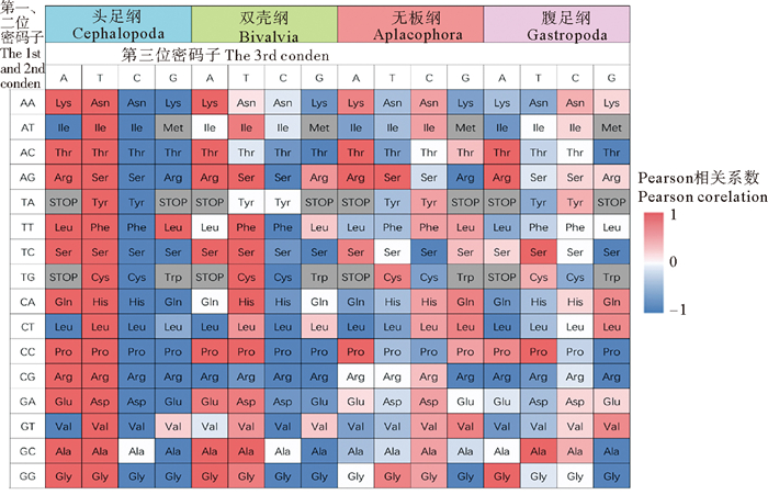 密码子相对使用频率分析表明, 除编码亮氨酸的密码子TGG外, 软体动物密码子使用明显分为GC结尾密码子偏好型和AT结尾密码子偏好型。同时, 物种的密码子使用频率也呈现出按分类阶元聚集的分层现象, 其中: 双壳纲和头足纲动物偏向于使用以AT结尾的密码子; 无板纲和腹足纲动物则对以GC结尾的密码子呈现更高的使用频率(见图 1(c))。这种现象可能与无板纲和腹足纲的基因组GC含量普遍较高有关。值得注意的是, 腹足纲的陆生褐云玛瑙螺(A. fulica)、两栖光滑双脐螺(B. glabrata)和生活在潮间带的帽贝(L. gigantea)同双壳动物类似, 偏向于使用以AT结尾的密码子, 三者的生态分布均包含陆生环境, 而本研究所涉及的其余腹足动物则完全营水生生活。无板纲闪耀毛皮贝(C. nitidulum)和F. caudatus也偏向于使用以AT结尾的密码子, 这两种尾腔动物(Caudofoveata)在海底沉积层中营固着滤食生活, 而本研究所分析的其余无板纲物种则属于运动能力更强的沟腹动物(Solenogastres), 主要分布于海底沉积物或藻类覆盖的岩石以及珊瑚礁中的细小缝隙等生境, 营捕食生活。研究结果暗示, 生境与习性的多样性会导致密码子使用偏好的差异。此外, 腹足纲和无板纲中有5个物种的GC3均明显低于其所属类群(见图 1(b)), 这表明密码子使用偏好类型主要受到GC含量而非其分类地位的影响。这一点与基因组碱基比例的差异趋势一致, 双壳纲和头足纲动物的GC含量较为均一, 密码子使用偏好类型也更相似; 而腹足纲和无板纲动物基因组中GC含量差异较大, 密码子使用偏好类型也更加多变。