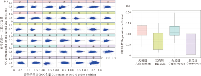 4 结语本研究系统分析了41种软体动物的基因编码序列, 旨在探究头足纲、腹足纲、双壳纲和无板纲这四个主要类群的密码子使用偏好特征和演化动力。研究结果显示: 大部分软体动物的密码子偏好性较弱, 且呈现出按分类阶元和基因组GC含量分层的密码子使用偏好, 其中双壳纲和头足纲动物偏向于使用以AT结尾的密码子, 而腹足纲和无板纲动物偏向于以GC结尾的密码子; 软体动物的密码子使用偏好类型主要受中性演化和自然选择共同影响, 但是这种影响在这四个类群间存在差异, 其中腹足动物较双壳纲、头足纲和无板纲受到的选择压力更大, 且选择压力集中于编码精氨酸的三种密码子的使用偏好上。本研究系统绘制了软体动物的密码子使用偏好图谱, 为深入理解其遗传多样性和基因组演化提供了重要见解。