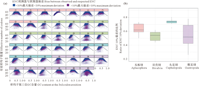 ((a)软体动物41个物种的ENC分布图, 其中ENC预期值和ENC观测值分别以黑色曲线和散点表示, 其中蓝色散点表示ENC观测值与预测值之差小于最大值的10%, 其余则为红色散点(a) ENC plots of 41 molluscan species. ENC expected values are displayed as black curve. ENC observations are represented by scatter points, in which points in blue indicating the difference between expected and observed ENC less than 10% of the maximum, with the remaining marked in red; 根据所属类群分组后, ENC观测值与预期值偏差小于最大值的10%的基因占比分布(b) The distribution of the proportion of genes with ENC observation values deviating from expected values by less than 10% of the maximum, grouped by their respective classes. ①: Alexandromenia crassa; ②: Chaetoderma nitidulum; ③: Entonomenia tricarinata; ④: Falcidens caudatus; ⑤: Helluoherpia aegiri; ⑥: Kruppomenia borealis; ⑦: Macellomenia schanderi; ⑧: Neomenia megatrapezata; ⑨: Proneomenia sluiteri; ⑩: Argopecten irradians; ⑪: Argopecten purpuratus; ⑫: Bathymodiolus platifrons; ⑬: Chlamys farreri; ⑭: Crassostrea gigas; ⑮: Mulinia lateralis; ⑯: Modiolus philippinarum; ⑰: Pinctada fucata; ⑱: Patinopecten yessonesis; ⑲: Scapharca broughtonii; ⑳: Sinonovacula constricta; ㉑: Tegillarca granosa; ㉒: Dosidicus gigias; ㉓: Euprymna scolopes; ㉔: Hapalochlaena maculosa; ㉕: Idiosepius notoides; ㉖: Octopus bimaculoides; ㉗: Octopus maya; ㉘: Octopus minor; ㉙: Sepia esculenta; ㉚: Sepia pharaonis; ㉛: Sepioloidea lineolata; ㉜: Achatina fulica; ㉝: Aplysia californica; ㉞: Biomphalaria glabrata; ㉟: Elysia chlorotica; ㊱: Haliotis discus; ㊲: Littorina saxatilis; ㊳: Lottia gigantea; ㊴: Potamopyrgus antipodarum; ㊵: Pomacea canaliculata; ㊶: Rapana venosa.) 图 5 软体动物41个物种的ENC分布图 Fig. 5 ENC plots of 41 molluscan species |