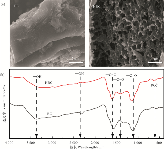 BC和HBC的表面形貌的扫描电镜图如图 1(a)所示。从图 1(a)中可知,BC表面光滑,孔隙密集且排列相对规则;而HBC表面更多的网状结构被紧密结合并逐层堆叠,形成更加稳定的碳基质骨架,有助于AMF存活[27]。