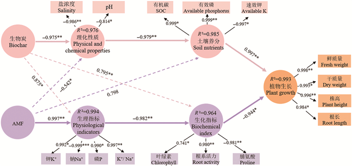 丛枝菌根真菌(Arbuscular mycorrhizal fungi, AMF)能够与90%的植物根系形成互惠共生[10],通过提高植物的根系活性、减少对盐的生理反应缓解盐胁迫损害,增强植物抗逆性,促进植物生长[11]。但盐碱土的极端理化环境严重制约了AMF的定植情况。将生物炭作为AMF的载体,有利于两者的协同作用。前人研究已经证明他们的联合应用能够显著提高植物的光合速率和植物生长[9, 12],但是在滨海盐碱土壤-植物系统中,两者分别作用的路径及互作机制尚不清晰,而且缺乏量化研究。