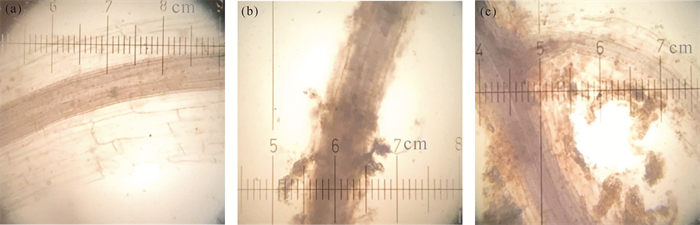 ((a)未接种AMF的植物根部;(b)接种AMF的植物根部;(c)生物炭和AMF联合诱导下AMF侵染情况。(a) Roots of plants not inoculated with AMF; (b) Roots of plants inoculated with AMF; (c) AMF infestation under combined induction of biochar and AMF.) 图 2 AMF侵染情况显微镜照片 Fig. 2 Micrographs of AMF infestation |