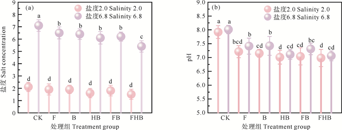 不同处理组对土壤盐浓度和pH值的影响见图 3。2.0盐度下,各处理组盐浓度无显著变化,可能是由于土壤初始盐度较低,生物炭和AMF的作用空间有限[32];6.8盐度下,盐浓度下降的趋势为FHB>HB>FB>B>F>CK。与CK组相比,两种盐度下各处理组的pH值均呈下降趋势,FHB组的pH值最低。盐浓度变化的原因是生物炭中的-COOH、-OH等含氧官能团具有吸附和离子交换能力,能够与土壤中的Na+发生相互作用,有效固定盐分,减轻土壤盐浓度[33];pH值变化的原因是:(1)HBC表面的磷酸基团(-PO43-)与土壤中的OH-发生中和反应,与CK相比,显著降低土壤pH;(2)AMF通过调控根际微环境,促进植物和微生物分泌有机酸进入根区土壤,进一步降低土壤pH[34]。2.0盐度下,各处理组对土壤pH值的改良效果相差不大,是由于土壤的缓冲能力使其变化相对稳定[35]。