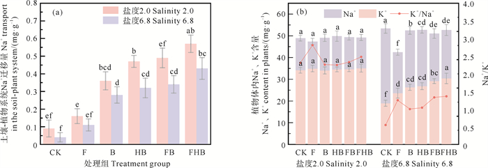 不同处理组对土壤-植物系统盐分迁移的调控效应如图 4所示。盐浓度显著影响土壤-植物系统中盐分的迁移及植物体内的Na+和K+含量。盐度越高,Na+从土壤向植物的迁移量越大,植物体内Na+含量越高。FHB组显著减少了Na+从土壤向植物的迁移,2.0盐度下,Na+变化量相比于CK组提高了5.3倍,说明生物炭的阳离子交换能力有效固定了Na+,改善了土壤的水盐分布,降低Na+向植物根系的迁移,有效缓解盐胁迫损害[36]。6.8盐度下,相较于CK组,FHB组中Na+含量降低了35.3%,K+含量升高了60.3%,K+/Na+提升了147.3%。盐碱条件下,K+/Na+是决定植物养分吸收和生物量的关键因素[37],过量盐离子会增加Na+和K+间的竞争,增加有毒Na+的积累,抑制K+的吸收,触发蛋白质合成和胞质酶活性的抑制,造成养分失衡[38]。添加AMF能够上调Na+逆向转运蛋白基因和K+/Na+协同转运蛋白基因,减少植物根对Na+的吸收,保护胞内K+介导的酶促过程免受盐胁迫损害,维持较高的K+/Na+,提高养分的选择性吸收[38]。而生物炭通过释放自身的营养物质,改善土壤团聚体,增加植物矿物质吸收,调节气孔导度和植物激素,减少Na+胁迫和细胞渗透胁迫对细胞膜的损伤,提高植物K+/Na+[39]。