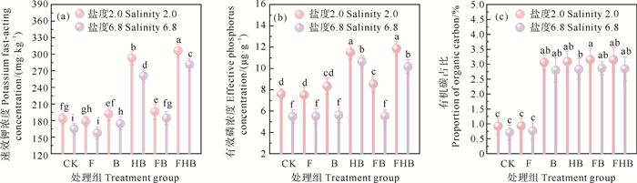 盐胁迫下生物炭和AMF对土壤养分变化的影响见图 5。各处理组中,土壤养分含量在两种盐度水平下均呈现出低促高抑的现象,其中,在2.0盐度下更为显著,与CK组相比,FHB组和HB组的速效钾含量分别提高了67.5%和60.1%,有效磷含量分别提高了56.3%和51.9%,土壤有机碳(soil organic carbon,SOC)含量分别提高了242.4%和235.9%,说明单独添加H3PO4改性生物炭对土壤养分有显著促进作用,而与AMF联合施用时促进效果最显著。生物炭的多孔结构和高比表面积能有效吸附K+,有助于土壤保水,从而改善滨海盐碱土壤结构,间接增强速效钾有效性,促进植物生长[40];H3PO4改性生物炭pH较低,可缓解盐碱土的pH值,提高土壤微生物活性,促进含钾矿物和难溶性磷的溶解,释放更多养分,形成正反馈,进而增加速效钾和有效磷含量[41]。此外,生物炭具有良好的碳稳定性,能够作为碳源保留碳[42],通过与土壤有机质、溶解有机碳和矿物质互动,促进土壤稳定团聚体形成,实现SOC的物理包封,提高土壤碳封存潜力[43]。