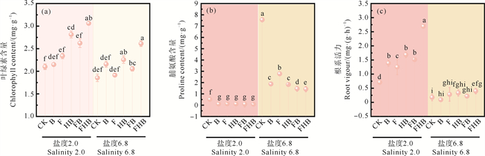 盐胁迫下生物炭和AMF对植物叶绿素、脯氨酸及根系活力含量变化的影响见图 6。各处理组在2.0盐度条件下的植物光合作用、渗透调节能力和根系活力均显著优于6.8盐度条件下的表现。2.0盐度下,与CK组相比,FHB组的叶绿素含量和根系活力分别提高了45.8%和279.8%,脯氨酸含量降低了84.3%。6.8盐度下,相较于CK组,FHB组的叶绿素含量和根系活力分别提高了40.8%和125.7%,脯氨酸含量降低了81.2%。