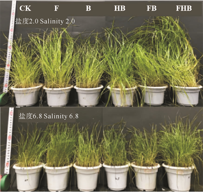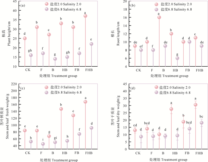 2.4.3 植物生长特征盆栽实验的植物生长60 d后的生长状态如图 7,生长指标如图 8所示。由图 7可知,各组生长状态表现为FHB>FB>F>HB>B>CK,说明生物炭与AMF联合应用效果最佳,单独添加AMF比单独添加生物炭对植株的生长更有利。此外,2.0盐度下FHB组植物生长效果比6.8盐度更佳,FHB组的株高、根长、鲜质量和干质量在2.0盐度下分别是CK组的1.5、5.5、2.0和2.4倍,表明AMF在盐胁迫环境下对植物根系生长的促进作用尤为关键。AMF通过与植物根系共生,扩展吸收面积,增强水分与养分摄取[48],进而有助于植物在盐胁迫环境中生长。此外,AMF在高盐条件下仍能有效维持植物的高干质量与鲜质量。而生物炭的存在能够优化土壤结构、增强通气与保水能力,改善与根系的相互作用,间接促进根系伸长和发育[49]。