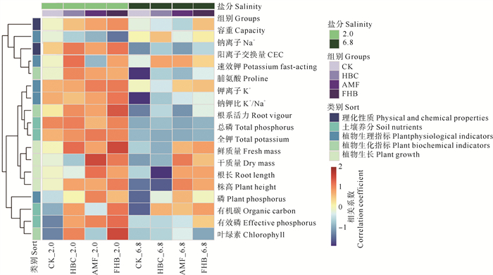 图 9 盐胁迫下生物炭和AMF对土壤-植物系统指标的聚类分析 Fig. 9 Cluster analysis of biochar and AMF on soil-plant system indicators under salt stress |